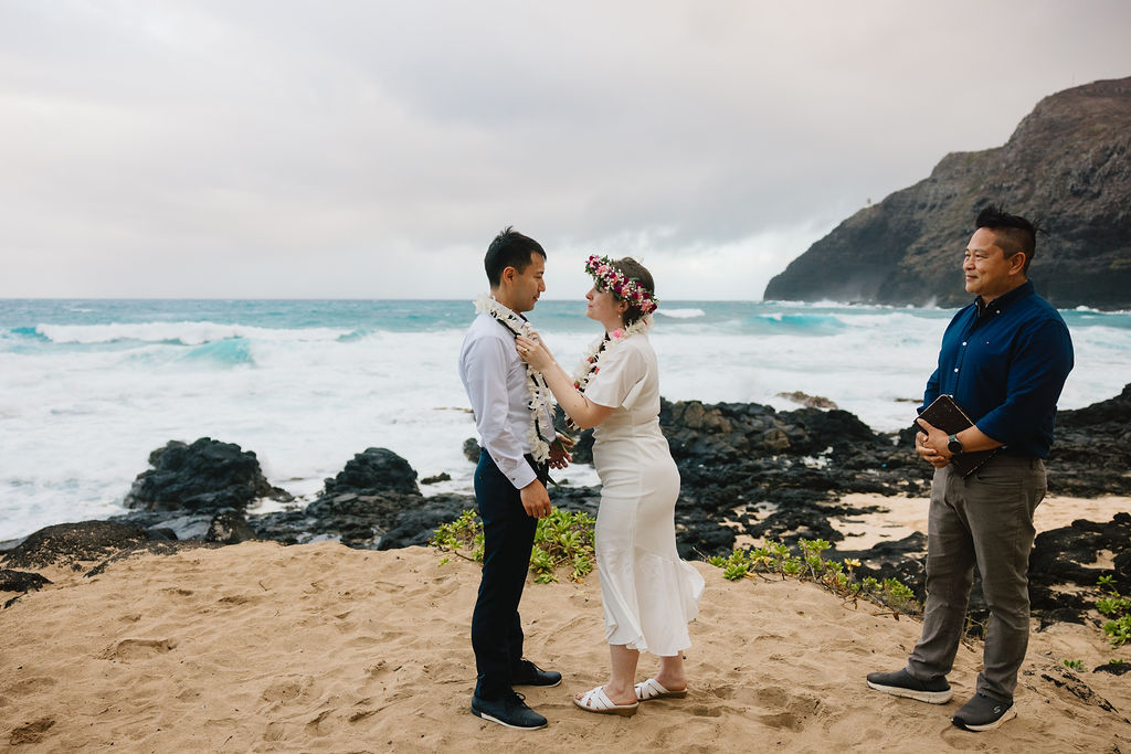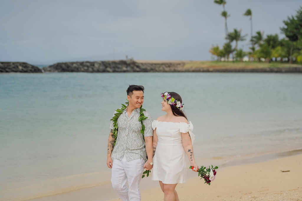 The Hawaiian wedding sand ceremony has been incorporated into many Oahu beach weddings and elopements because it fits the setting so naturally. Each partner pours sand from a separate container into a shared vessel. The two colors blend together, symbolizing that they are inseparable after that moment.