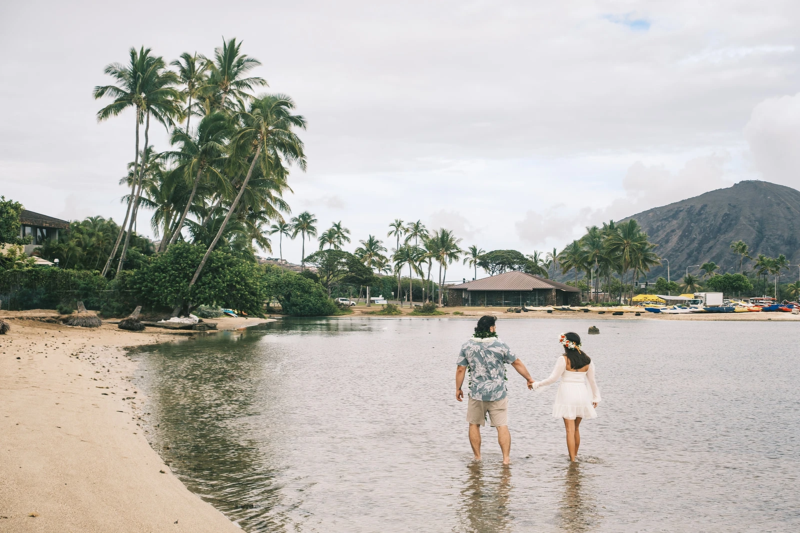 Kuliʻouʻou Beach Park is an intimate island setting perfect for your vows. Enjoy calm, shallow water that stretches toward the reef, creating a stunning reflective surface for photos. Framed by iconic Hawaiian hills, the park features a beautiful grassy area and mature palm trees. At low tide, a vast sandbank appears, offering a unique and secluded backdrop for truly breathtaking, romantic moments. Restrooms are nearby. For a calm and serene spot where you can comfortably talk a stroll in the water together, Kuliouou could be the place of your wedding dreams! In considering Kuliouou Beach, you may want to know: